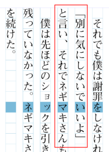 ぼく自身はこういう書き方をしたことはないけど、改行コードが入ったからと言って必ずしも段落的に分割するわけじゃない、という状況がある。上の例では、段落中のセリフを独立させるが段落的にはつながっている、ということを示すために「と言い」のところを天ツキにしている。